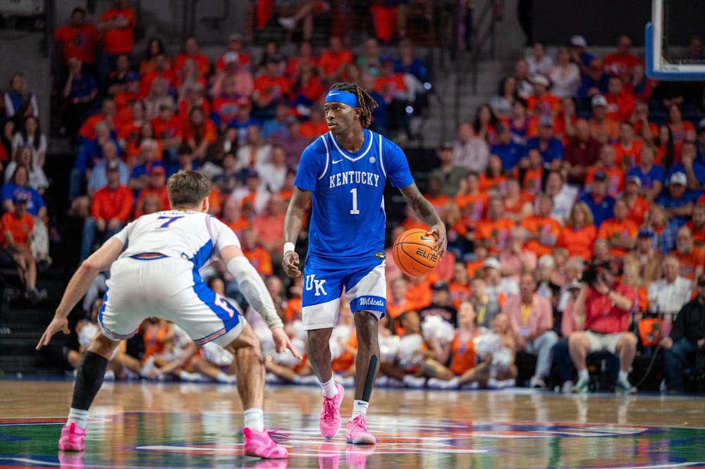 Kentucky guard Denzel Aberdeen (1) looks for a lane during the second half of an NCAA college basketball game against Florida, Saturday, Feb. 14, 2026 at Exactech Arena in Gainesville, Fla.