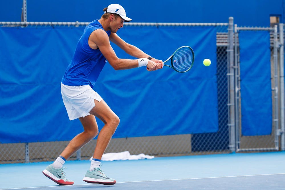 Florida tennis player Henry Jefferson returns a serve during an NCAA tennis match against Vanderbilt, Thursday, April 2, 2026, in Gainesville, Fla.