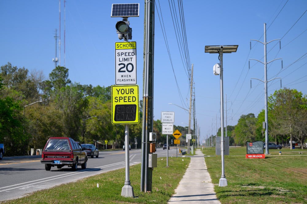 A speed camera on NW 43rd Street outside William S. Talbot Elementary School, Saturday, March 21, 2026, in Gainesville, Fla.