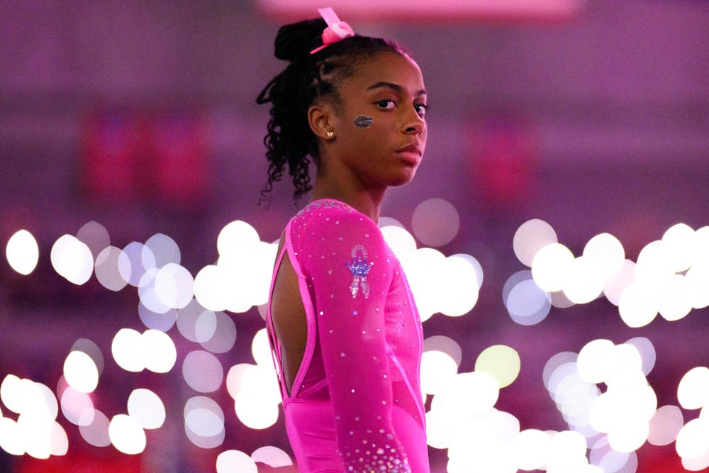 Florida gymnast Anya Pilgrim watches the crowd during “I Won’t Back Down” by Tom Petty during an NCAA gymnastics meet against Oklahoma, Friday, Feb. 13, 2026, in Gainesville, Fla.