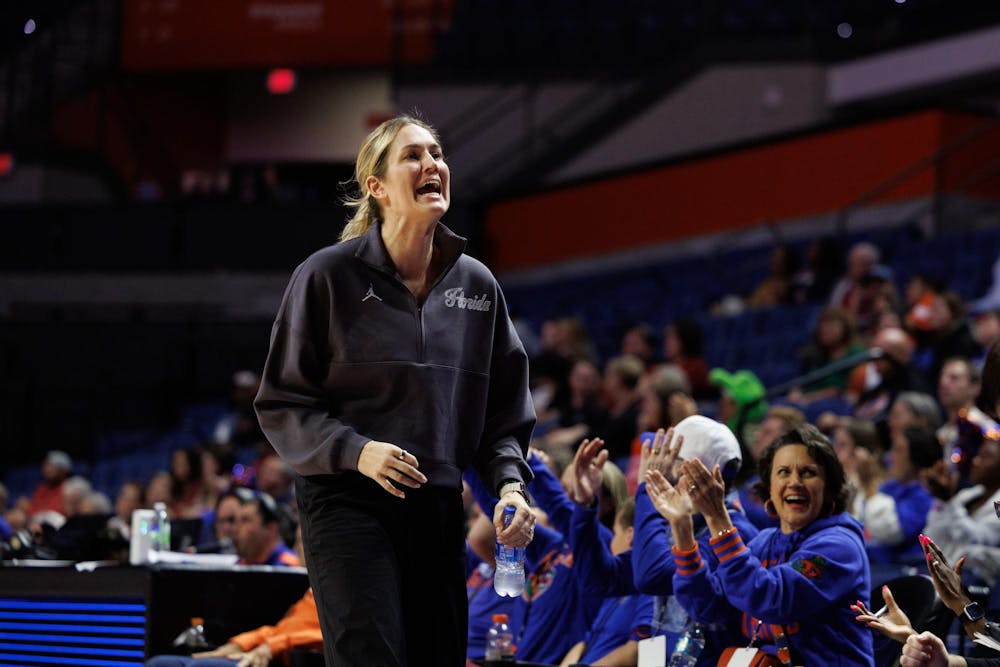 Florida head coach Kelly Rae Finley during the second half of an NCAA basketball game against Arkansas, Sunday, Feb. 8, 2026, in Gainesville, FL.
