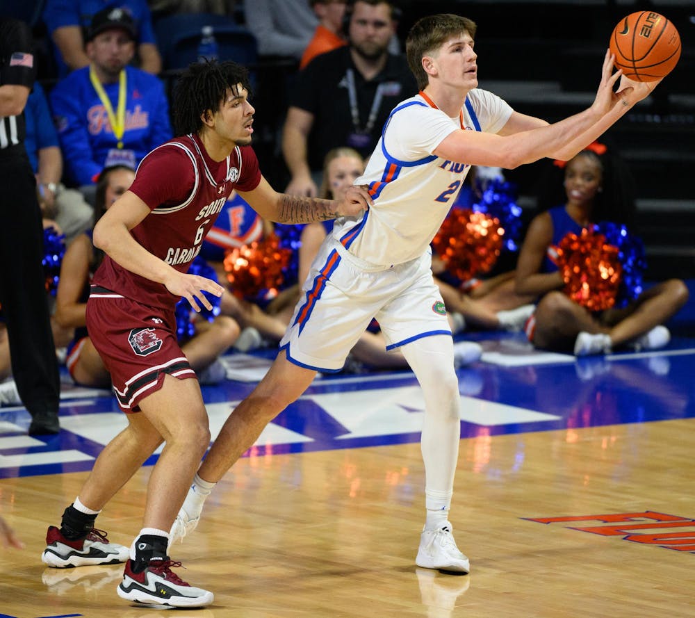 Florida forward Alex Condon (21) passes during the first half of an NCAA college basketball game against South Carolina, Tuesday, Feb. 17, 2026, in Gainesville, Fla.