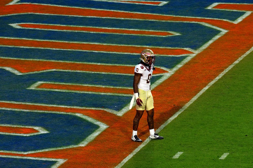 FSU defensive back Earl Little Jr. stands in the endzone during a rivalry game against UF at the Ben Hill Griffin Stadium on Saturday, Nov. 29, 2025.