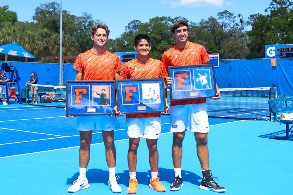 Pablo Perez, Tanapatt Nirundorn, and Lorenzo Clavier accept plaques honoring their time on the Florida Men's Tennis team at their senior night game against Louisiana State, Saturday, April 4, 2026.