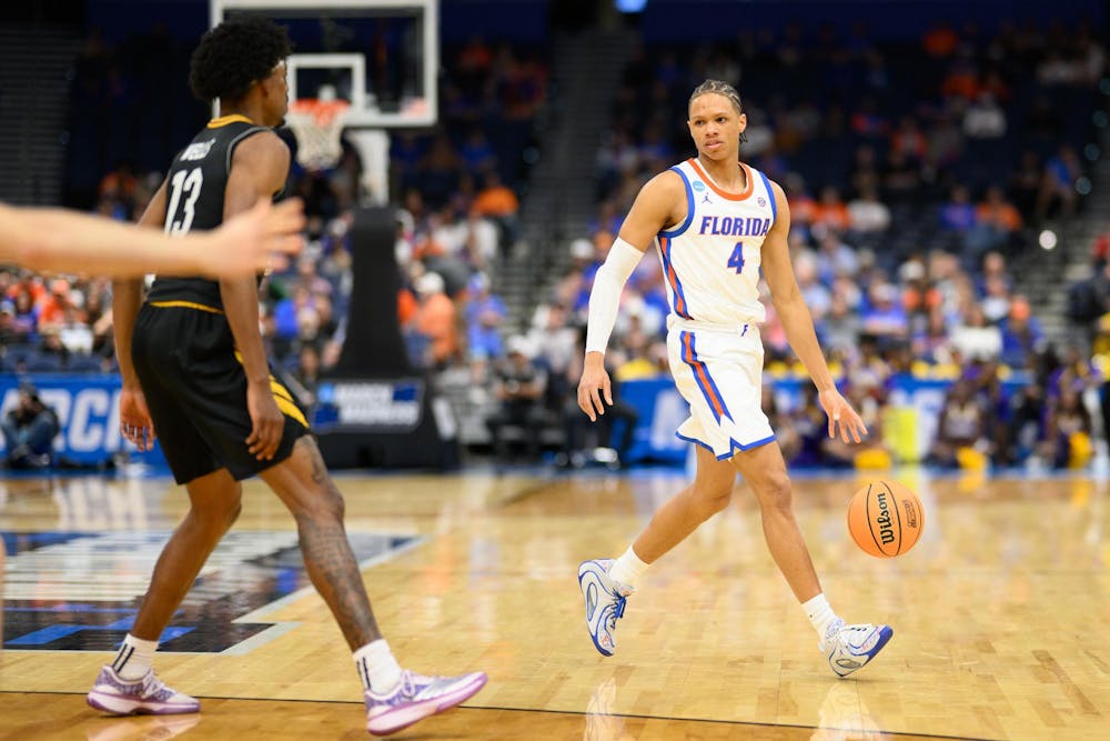 Florida guard Alex Lloyd (4) dribbles during the second half of an NCAA Tournament first round game against Prairie View A&M, Friday, March 20, 2026, in Tampa, Fla.