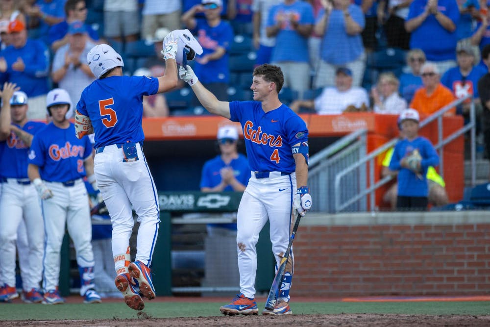 Florida infielder Cade Kurland (4) and infielder Blake Cyr (5) high-five after a home run during an NCAA college baseball game against Auburn at Condron Family Ballpark in Gainesville, Fla., Friday, April 17, 2026.