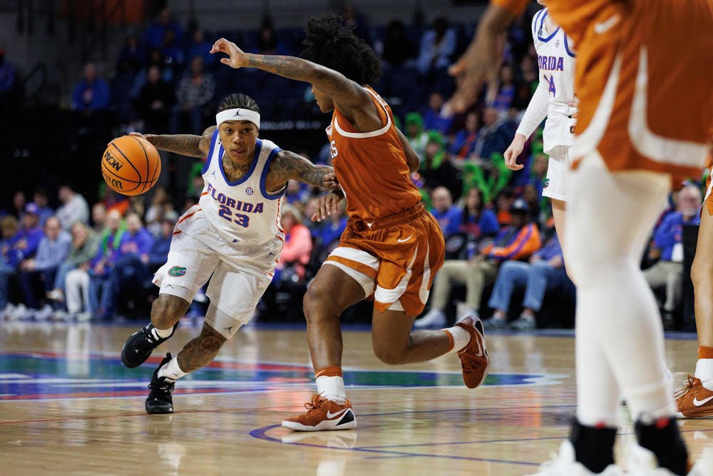 Florida guard Liv McGill (23) dribbles during the first half of an NCAA basketball game against Texas, Thursday, Jan. 29, 2026, in Gainesville, Fla.