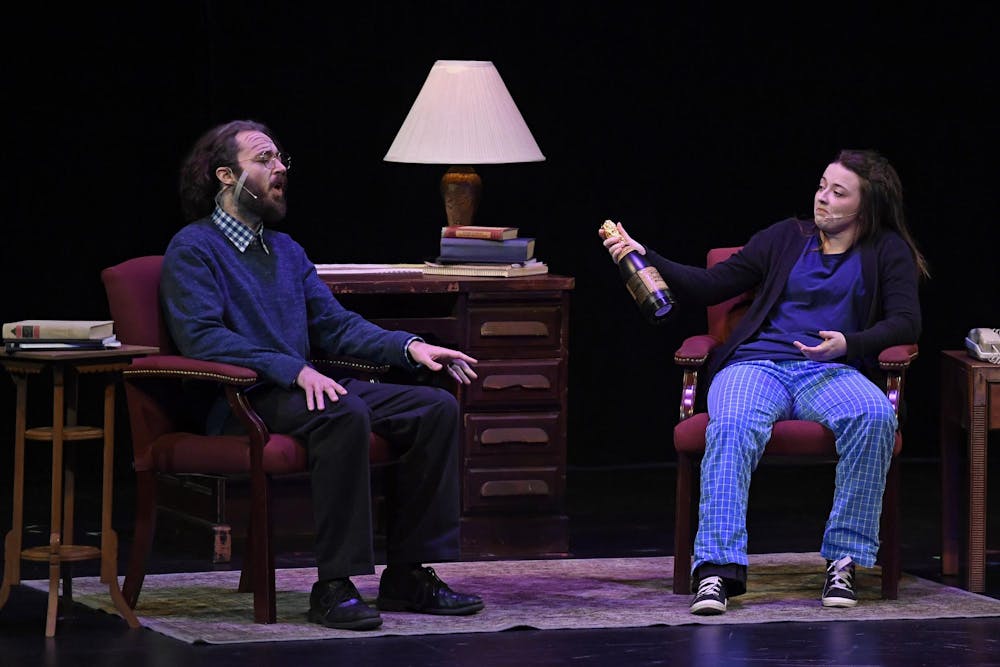 An actress offers an actor a bottle of champagne as a “ten-minute play” is performed on Friday, Jan. 30, 2026, at the Jackson N. Sasser Fine Arts Hall at Santa Fe College in Gainesville, Fla.