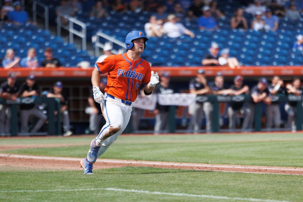 Florida catcher Karson Bowen (14) runs to first base during an NCAA baseball game against High Point University, Friday, March 8, 2026, in Gainesville, Fla.