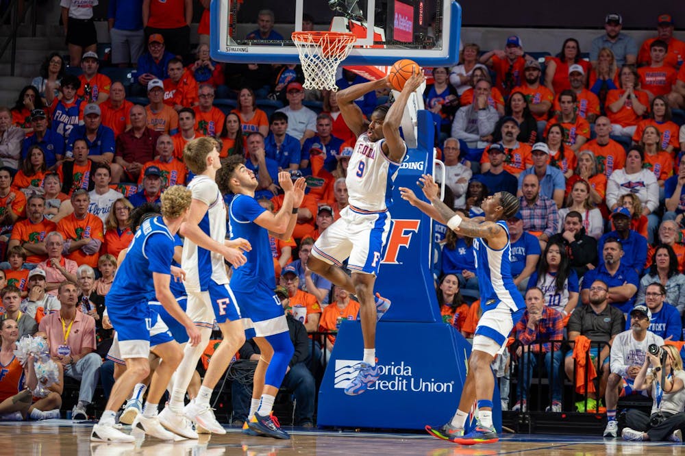 Florida center Rueben Chinyelu (9) reaches for the rebound during the second half of an NCAA college basketball game against Kentucky, Saturday, Feb. 14, 2026 at Exactech Arena in Gainesville, Fla.