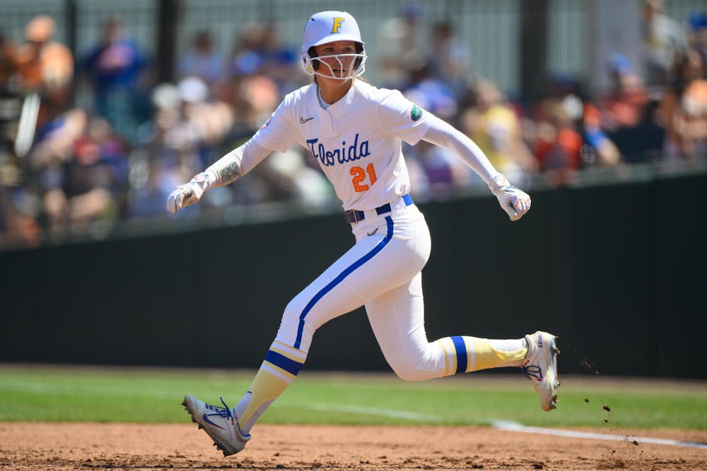 Florida outfielder Taylor Shumaker (21) starts toward second base during an NCAA softball game against Tennessee, Saturday, March 21, 2026, in Gainesville, Fla.