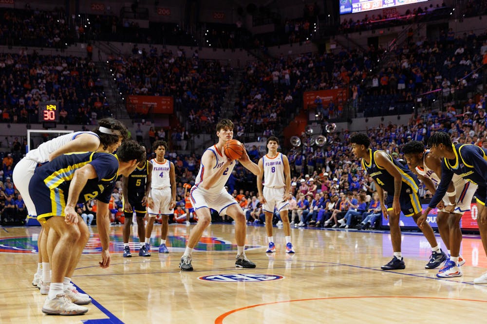 Florida Gators center Olivier Rioux (32) takes a free throw during the second half of a NCAA college basketball game against Merrimack, Friday, Nov. 21, 2025, in Gainesville, Fla.