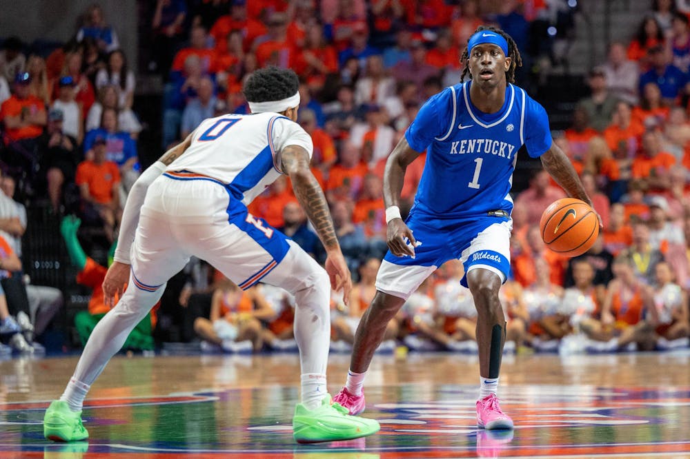 Kentucky guard Denzel Aberdeen (1) dribbles against Florida guard Boogie Fland (0) during the second half of an NCAA college basketball game, Saturday, Feb. 14, 2026 at Exactech Arena in Gainesville, Fla.