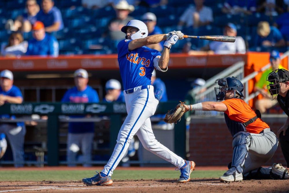 Florida outfielder Kyle Jones (3) hits during an NCAA college baseball game against Auburn at Condron Family Ballpark in Gainesville, Fla., Friday, April 17, 2026.