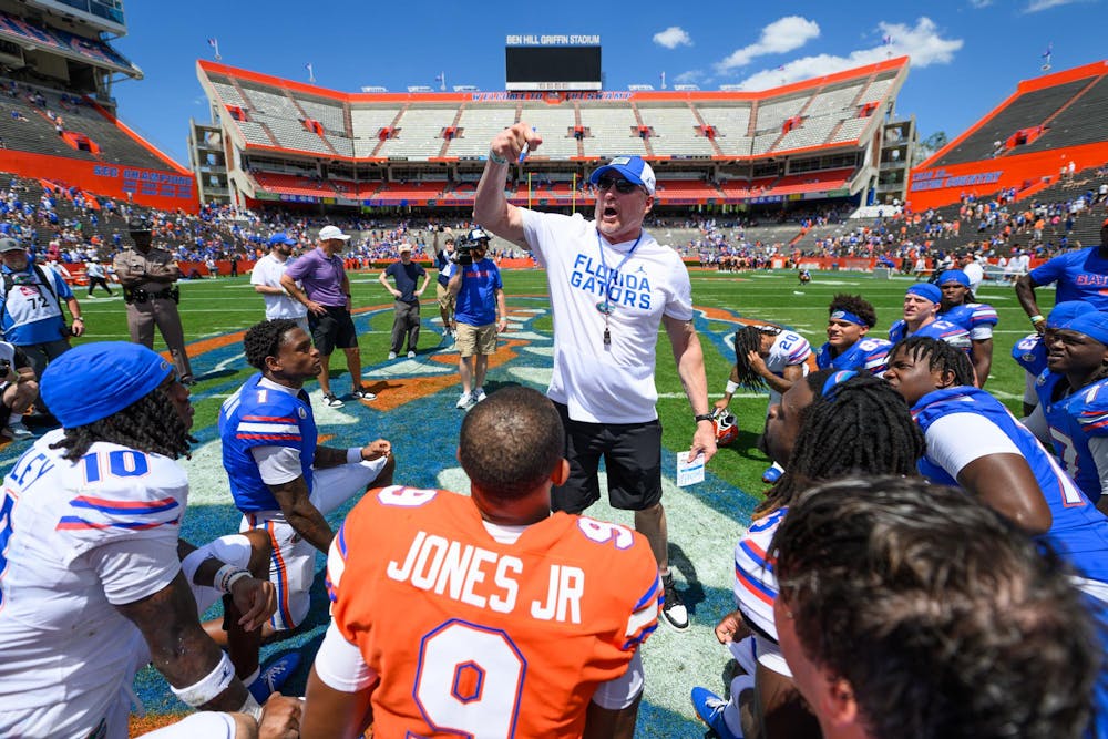 Director of football performace Rusty Whitt coaches in the post-game huddle after the Orange & Blue spring football game, Saturday, April 11, 2026, in Gainesville, Fla.