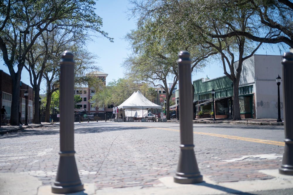 The north block of SW 1st Avenue in Gainesville, Fla., is already a pedestrian street, with businesses like The Bull having access to the entire street to use for seating and other purposes, Friday, April 17, 2026.