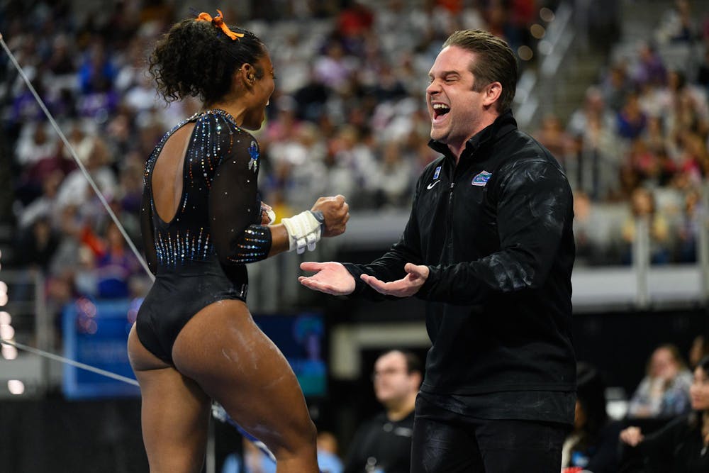Florida gymnast Selena Harris-Miranda celebrates with associate head coach Owen Field after her bars routine during the NCAA gymnastics National Championship against Oklahoma, LSU and Minnesota, Saturday, April 18, 2026, in Fort Worth, Texas.