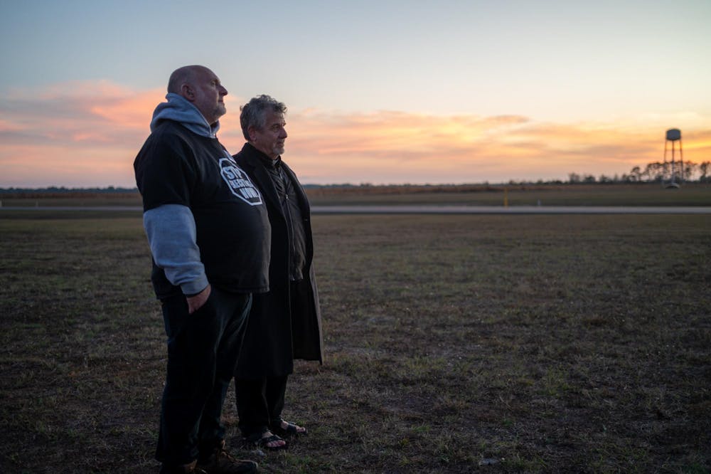 Reverend Phillip Egitto speaks with Abraham Bonowitz outside Florida State Prison in opposition to the execution of Mark Allen Geralds. Geralds was executed in Raiford on Tuesday, Dec. 9, 2025.