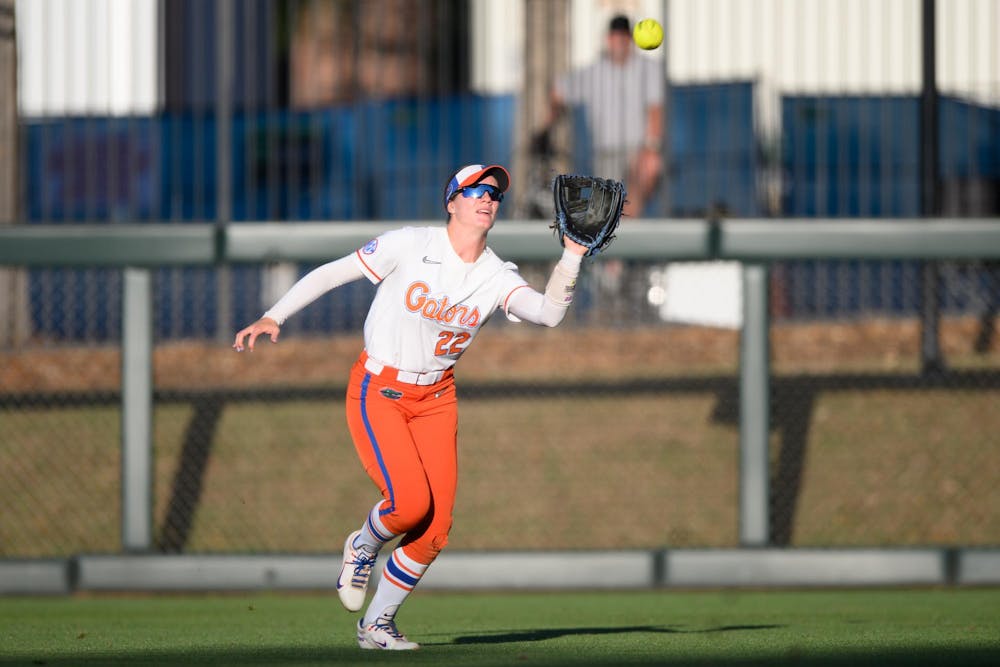 Florida outfielder Cassidy McLellan (22) catches during an NCAA softball game against FGCU, Wednesday, April 15, 2026, in Gainesville, Fla.