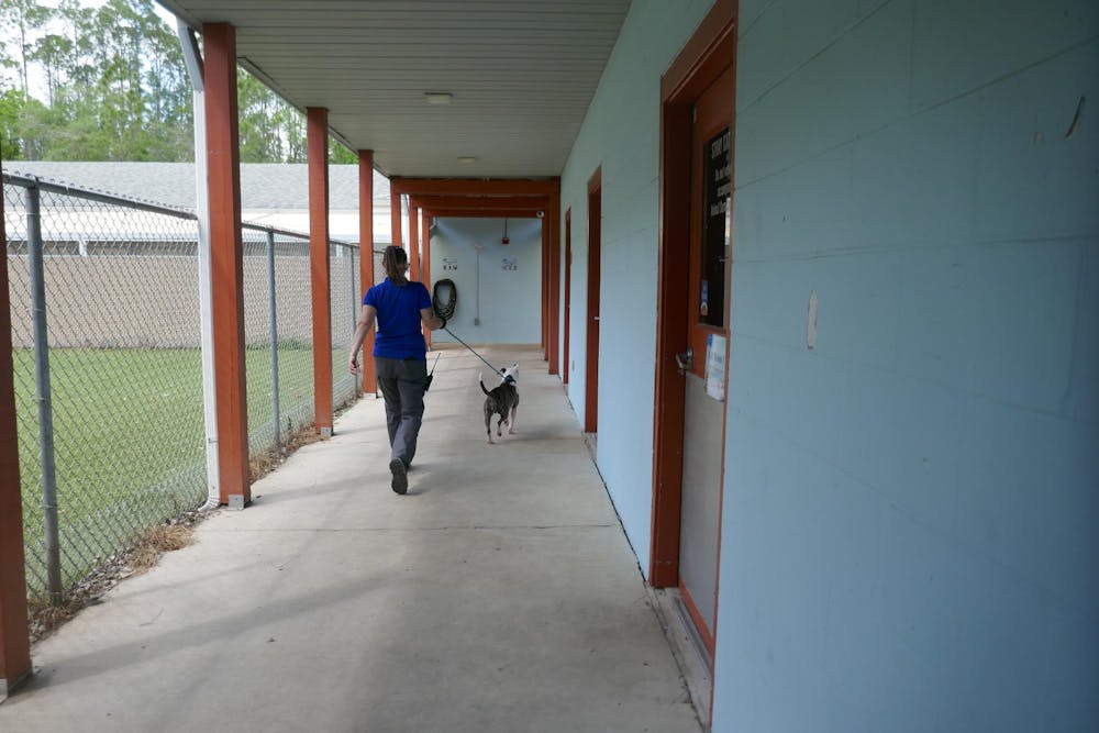 A volunteer walks a dog at Alachua County Animal Resources on Tuesday, March 31, 2026, in Gainesville, Fla.