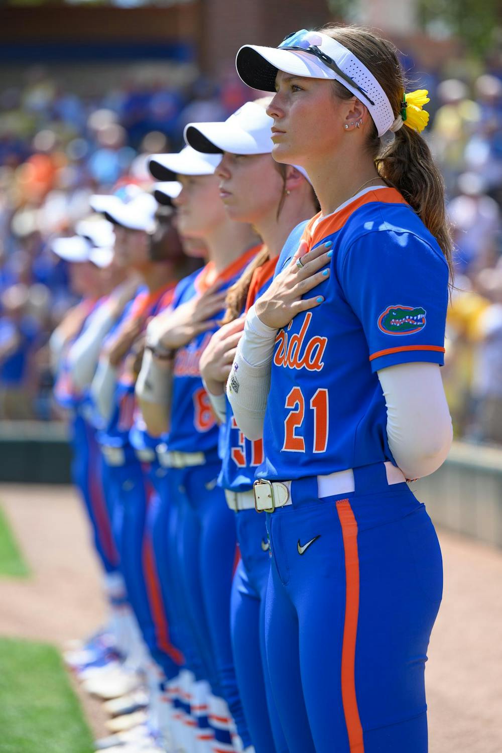 Florida outfielder Taylor Shumaker (21) stands with her team for the national anthem before an NCAA softball game against Mississippi State, Saturday, April 4, 2026, in Gainesville, Fla.