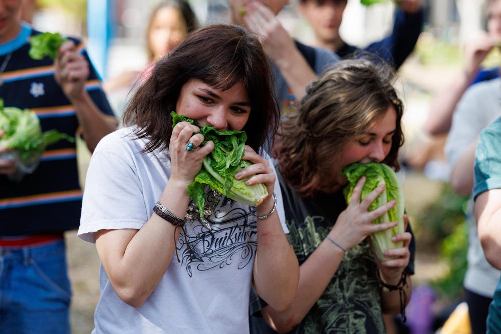 Sophomore Zoe Englander takes a bite of lettuce during the UF Lettuce Club’s lettuce eating competition, Thursday, Feb. 19, 2026, in Gainesville, Fla.