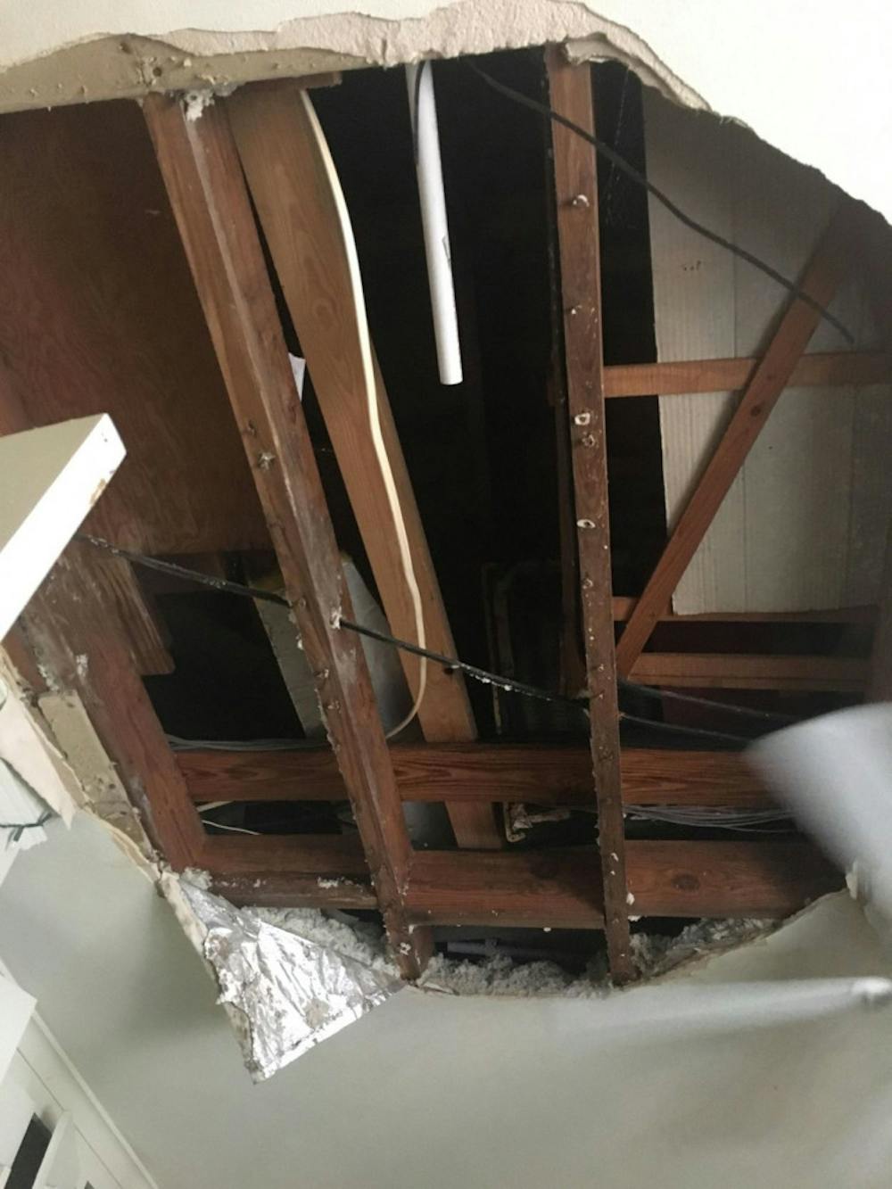 The ceiling in a bedroom at College Park Apartments collapsed Wednesday. As of Saturday, nothing had been done.