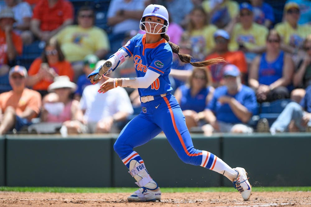 Florida infielder Gabi Comia (10) hits during an NCAA softball game against Mississippi State, Saturday, April 4, 2026, in Gainesville, Fla.
