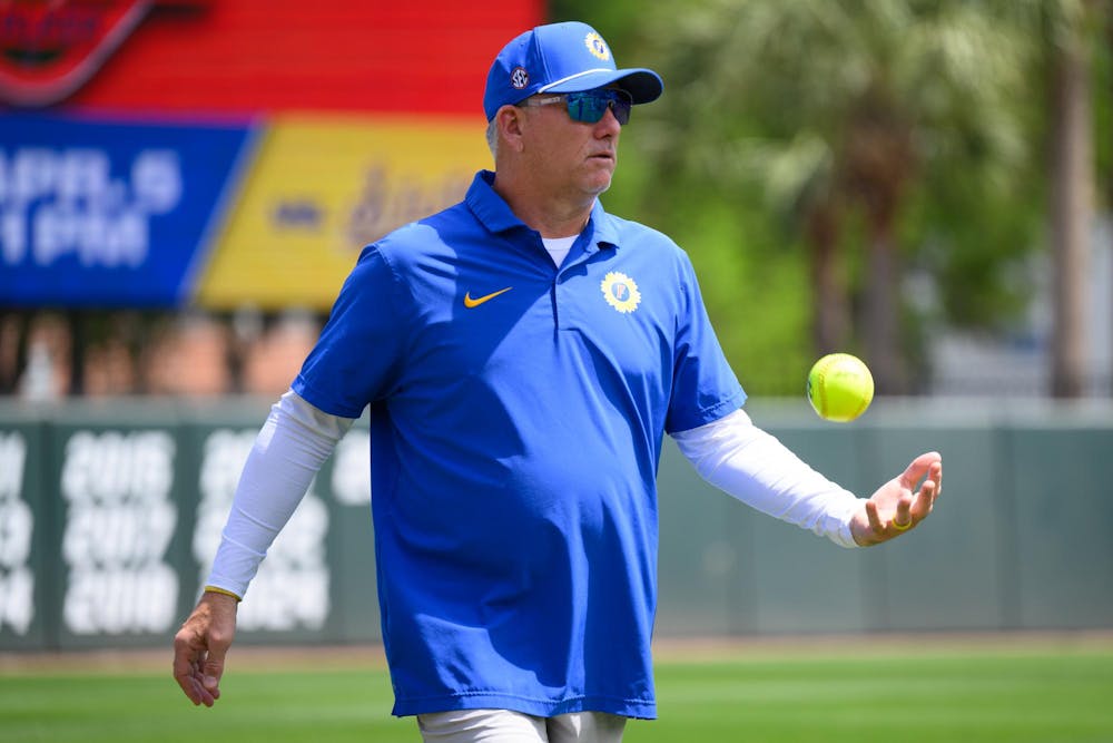 Florida head coach Tim Walton tosses a ball before an NCAA softball game against Mississippi State, Saturday, April 4, 2026, in Gainesville, Fla.