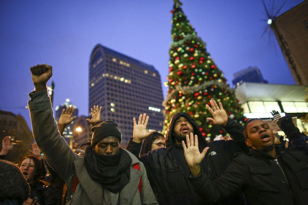 Protesters of a grand jury's decision not to indict a police officer in the fatal shooting of Michael Brown gather at Westlake Center where they disrupted the annual tree lighting, Friday, Nov. 28, 2014, in Seattle.The tree was still lit but the mall closed after a few hundred protesters forced their way onto the upper level stage where carolers and other performers were to perform. (AP Photo/seattlepi.com, Joshua Trujillo)