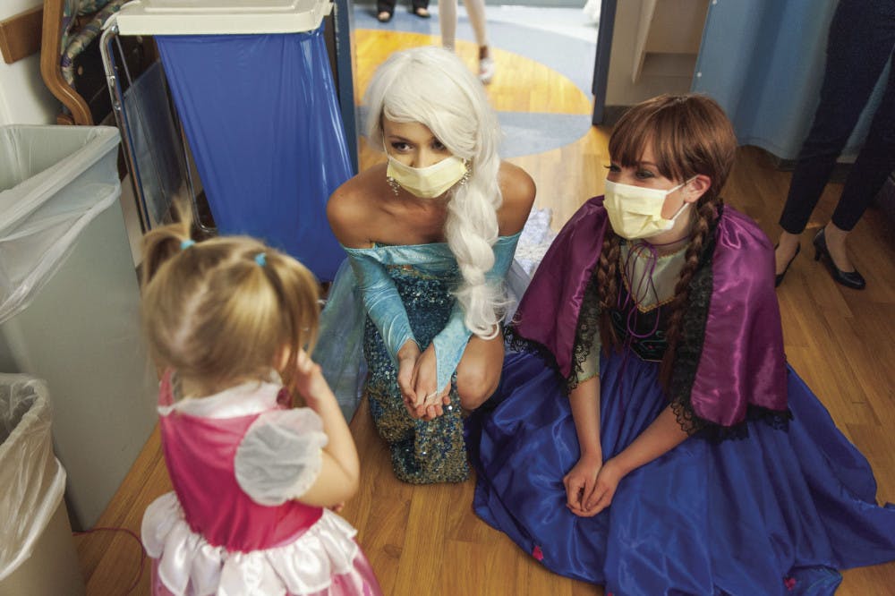 UF tourism and hospitality management sophomore Whitney Mecca, dressed as Elsa from “Frozen,” and UF psychology freshman Cassie Mead, dressed as Anna, visit a young patient at UF Health Shands Hospital.