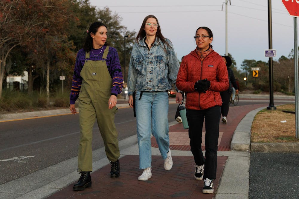 Hollyn Belhart, Christy Lynch and Natalia Medina walk on trail during a City Girls Who Walk Gainesville meet in Gainesville, Fla., Wednesday, Jan. 28, 2026.