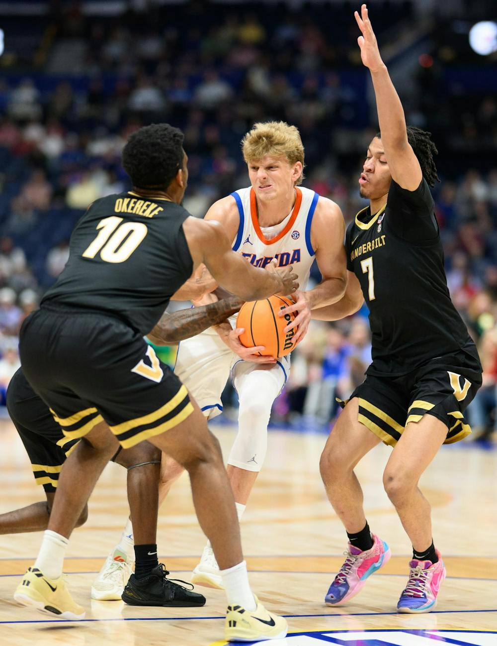 By Noah Lantor | 2:11pmFlorida forward Thomas Haugh (10) drives during the first half of an SEC Men's Basketball Tournament semifinal game against Vanderbilt, Saturday, March 14, 2026, in Nashville, Tenn.