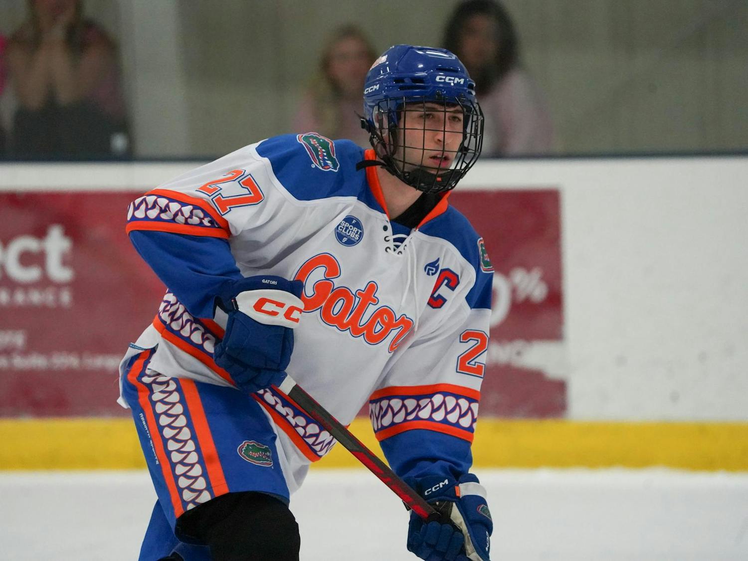 By Ryan Friedenberg | 11:16amMichael McCoy slaps the puck during the Gators' match against the ERAU Eagles on Sunday, September 7, 2025 at Community First Igloo in Jacksonville, Fla. / Photo by Ryan Friedenberg