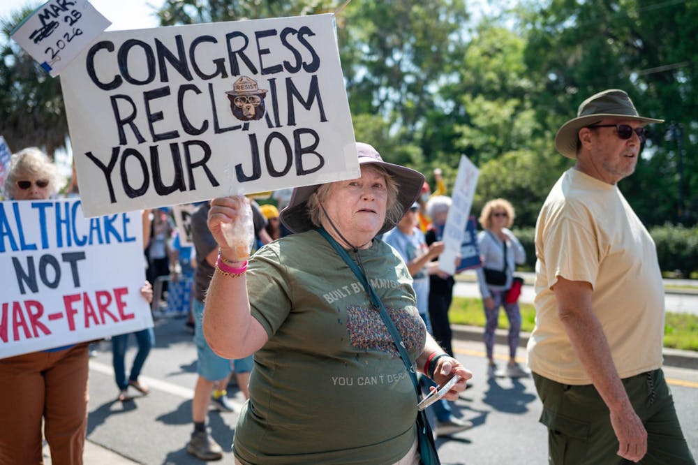 Protestors march down Depot Avenue, Saturday, March 28, 2026, in Gainesville, Fla.