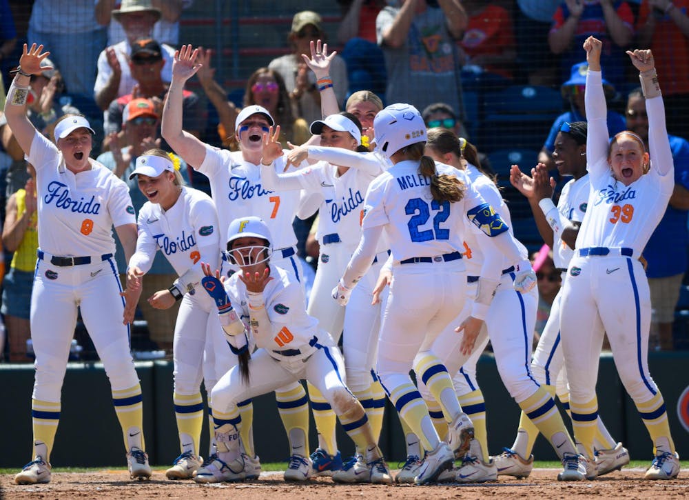 Florida celebrates a home run by outfielder Cassidy McLellan (22) during an NCAA softball game against Tennessee, Saturday, March 21, 2026, in Gainesville, Fla.