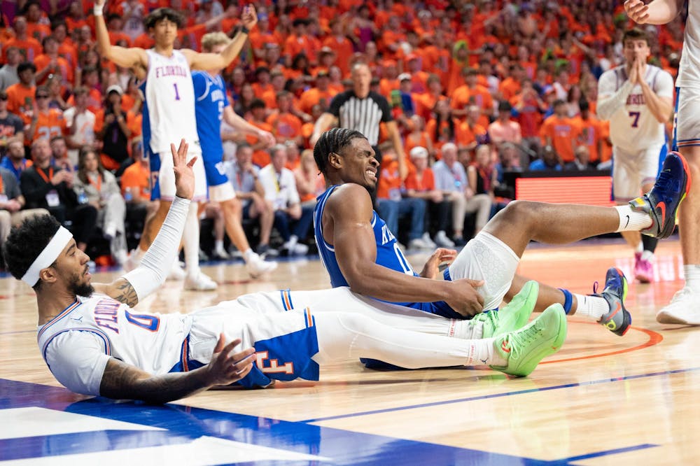 Kentucky guard Otega Oweh (00) winces after falling during the second half of an NCAA college basketball game against Florida, Saturday, Feb. 14, 2026 at Exactech Arena in Gainesville, Fla.