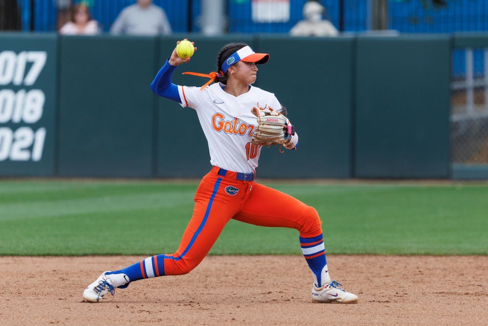 Florida Gators infielder Gabi Comia throws to first base during an NCAA softball game against Mississippi State, Sunday, April 5, 2026, in Gainesville, Fla.