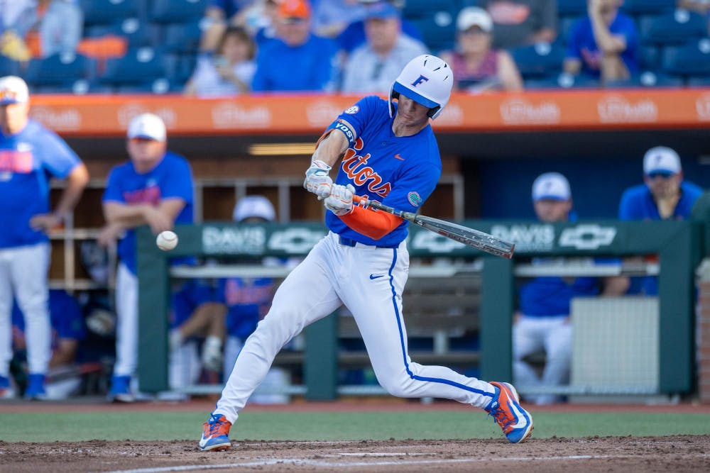 Florida outfielder Hayden Yost (16) hits during an NCAA college baseball game against Auburn at Condron Family Ballpark in Gainesville, Fla., Friday, April 17, 2026.