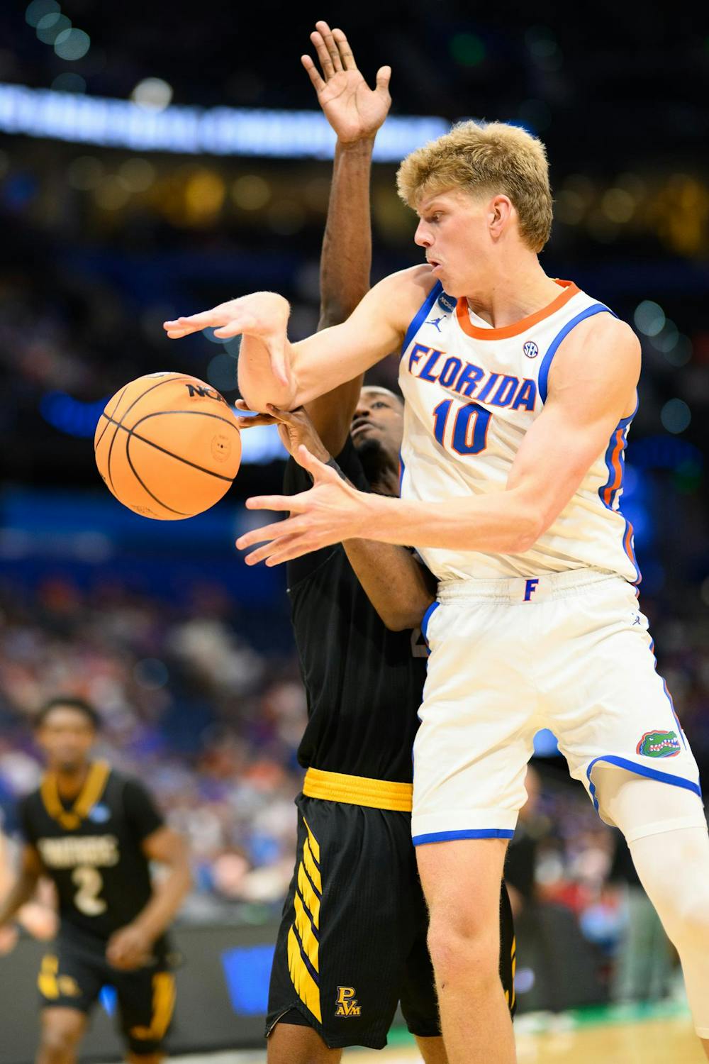 Florida forward Thomas Haugh (10) passes during the second half of an NCAA Tournament first round game against Prairie View A&M, Friday, March 20, 2026, in Tampa, Fla.