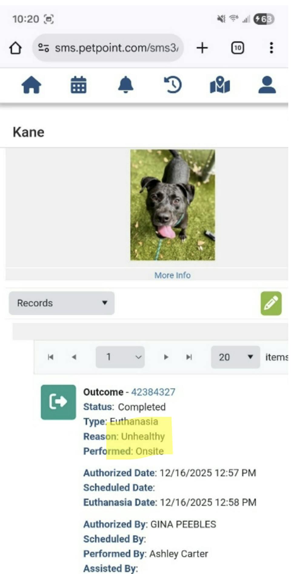 In his whistleblower email, Anthony Friedell included a screenshot of the euthanasia record of Alachua County Animal Resources shelter dog Kane. The authorization date and euthanasia date marked by Gina Peebles were recorded within a minute of each other.