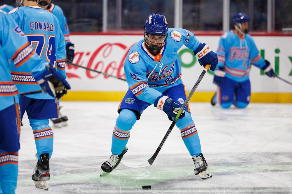 University of Florida Club Hockey forward Sully Swierz warms up ahead of the team’s game against Tennessee, Friday, Jan. 16, 2026 in Savannah, Ga.