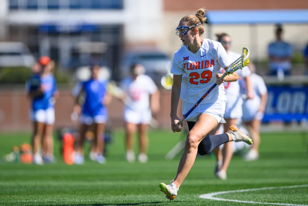 Florida midfielder Boo DeWitt (29) runs during the second half of an NCAA lacrosse match against Michigan, Friday, Feb. 13, 2026, in Gainesville, Fla.