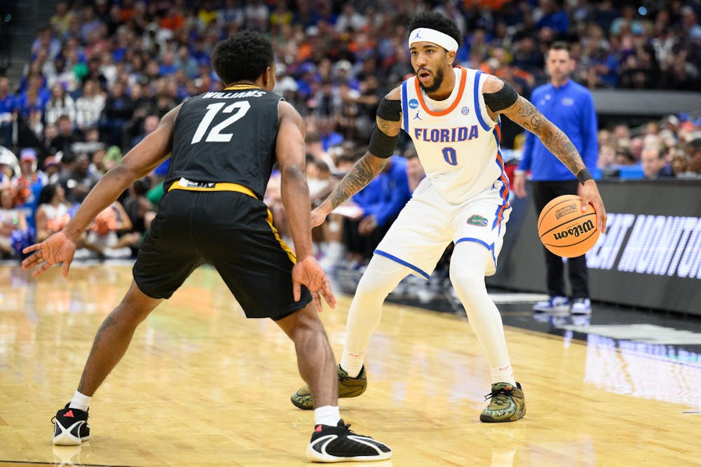 Florida guard Boogie Fland (0) dribbles during the first half of an NCAA Tournament first round game against Prairie View A&M, Friday, March 20, 2026, in Tampa, Fla.