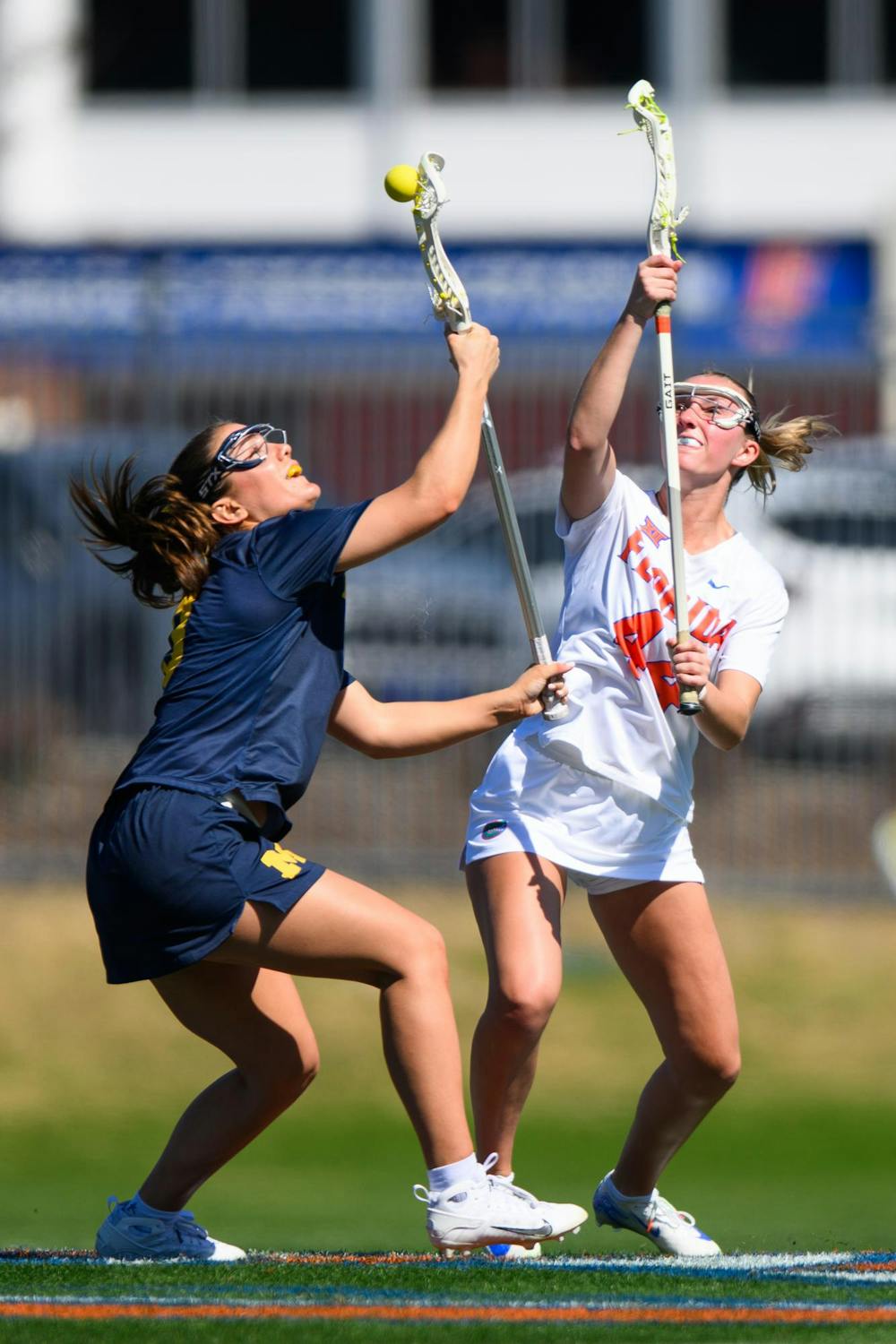 Florida attacker Allison Fling (44) takes a face-off during the first half of an NCAA lacrosse match against Michigan, Friday, Feb. 13, 2026, in Gainesville, Fla.