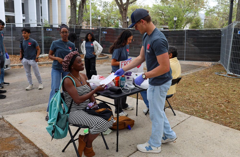 Lilliana Wells gets a blood pressure test from an H4H volunteer outside Gainesville City Hall, Sunday, March 29, 2026, in Gainesville, Fla.