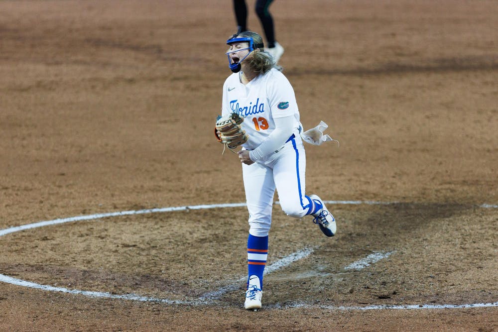Florida Gators left handed pitcher Olivia Miller yells after bases loaded strike out to end the inning during an NCAA softball game against Stetson, Wednesday, March 25, 2026, in Gainesville, Fla.