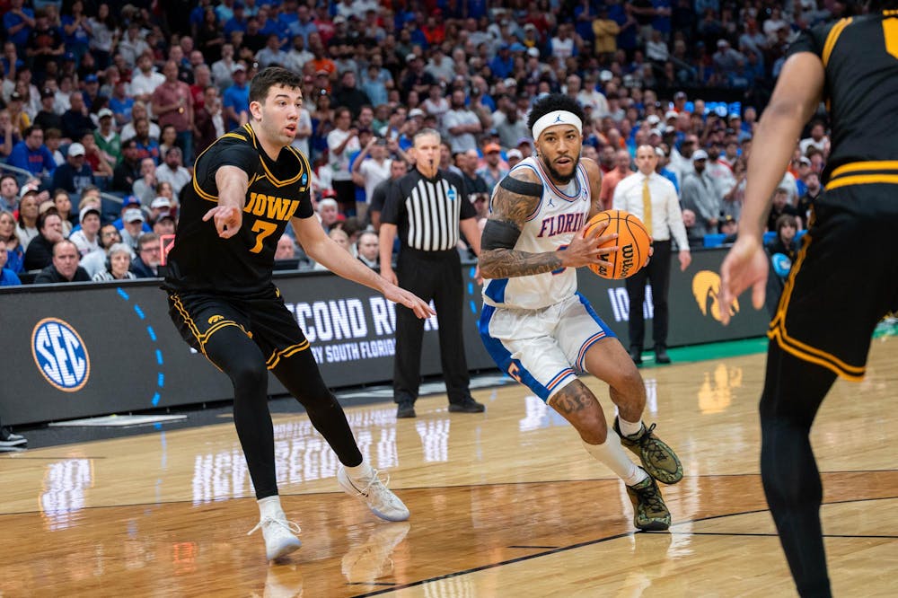 Florida guard Boogie Fland (0) drives to the basket during the second half of an NCAA Tournament second round game against Iowa, Sunday, March 22, 2026, in Tampa, Fla.