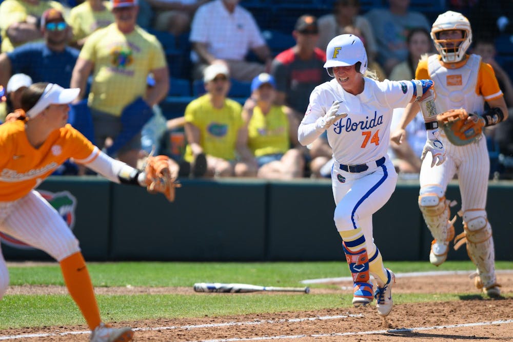Florida catcher Ella Wesolowski (74) runs to first base during an NCAA softball game against Tennessee, Saturday, March 21, 2026, in Gainesville, Fla.