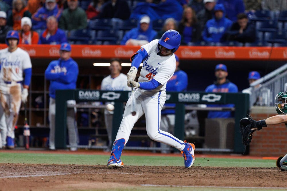 Florida Gators outfielder Jacob Kendall hits the ball during an NCAA Baseball game against UAB, Friday, Feb. 13, 2026, in Gainesville, Fla.
